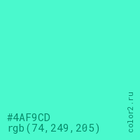 Цвет #4AF9CD в цветовой модели RGB обозначается тремя октетами (74, 249, 205) в десятичном формате и #4AF9CD в шестнадцатиричном (hex) формате, которые являются интенсивностью красного 74 (hex 4A), интенсивность зелёного 249 (hex F9) и интенсивность синего 205 (hex CD).