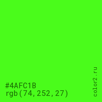 Цвет #4AFC1B в цветовой модели RGB обозначается тремя октетами (74, 252, 27) в десятичном формате и #4AFC1B в шестнадцатиричном (hex) формате, которые являются интенсивностью красного 74 (hex 4A), интенсивность зелёного 252 (hex FC) и интенсивность синего 27 (hex 1B).