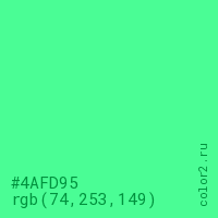 Цвет #4AFD95 в цветовой модели RGB обозначается тремя октетами (74, 253, 149) в десятичном формате и #4AFD95 в шестнадцатиричном (hex) формате, которые являются интенсивностью красного 74 (hex 4A), интенсивность зелёного 253 (hex FD) и интенсивность синего 149 (hex 95).
