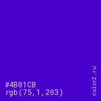 Цвет #4B01CB в цветовой модели RGB обозначается тремя октетами (75, 1, 203) в десятичном формате и #4B01CB в шестнадцатиричном (hex) формате, которые являются интенсивностью красного 75 (hex 4B), интенсивность зелёного 1 (hex 01) и интенсивность синего 203 (hex CB).