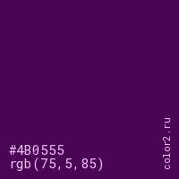 Цвет #4B0555 в цветовой модели RGB обозначается тремя октетами (75, 5, 85) в десятичном формате и #4B0555 в шестнадцатиричном (hex) формате, которые являются интенсивностью красного 75 (hex 4B), интенсивность зелёного 5 (hex 05) и интенсивность синего 85 (hex 55).