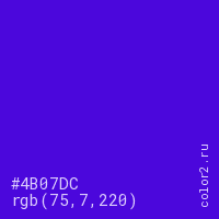 Цвет #4B07DC в цветовой модели RGB обозначается тремя октетами (75, 7, 220) в десятичном формате и #4B07DC в шестнадцатиричном (hex) формате, которые являются интенсивностью красного 75 (hex 4B), интенсивность зелёного 7 (hex 07) и интенсивность синего 220 (hex DC).