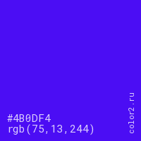Цвет #4B0DF4 в цветовой модели RGB обозначается тремя октетами (75, 13, 244) в десятичном формате и #4B0DF4 в шестнадцатиричном (hex) формате, которые являются интенсивностью красного 75 (hex 4B), интенсивность зелёного 13 (hex 0D) и интенсивность синего 244 (hex F4).