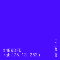 Цвет #4B0DFD в цветовой модели RGB обозначается тремя октетами (75, 13, 253) в десятичном формате и #4B0DFD в шестнадцатиричном (hex) формате, которые являются интенсивностью красного 75 (hex 4B), интенсивность зелёного 13 (hex 0D) и интенсивность синего 253 (hex FD).