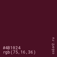 Цвет #4B1024 в цветовой модели RGB обозначается тремя октетами (75, 16, 36) в десятичном формате и #4B1024 в шестнадцатиричном (hex) формате, которые являются интенсивностью красного 75 (hex 4B), интенсивность зелёного 16 (hex 10) и интенсивность синего 36 (hex 24).