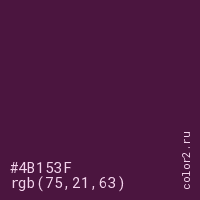 Цвет #4B153F в цветовой модели RGB обозначается тремя октетами (75, 21, 63) в десятичном формате и #4B153F в шестнадцатиричном (hex) формате, которые являются интенсивностью красного 75 (hex 4B), интенсивность зелёного 21 (hex 15) и интенсивность синего 63 (hex 3F).