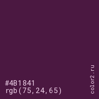 Цвет #4B1841 в цветовой модели RGB обозначается тремя октетами (75, 24, 65) в десятичном формате и #4B1841 в шестнадцатиричном (hex) формате, которые являются интенсивностью красного 75 (hex 4B), интенсивность зелёного 24 (hex 18) и интенсивность синего 65 (hex 41).