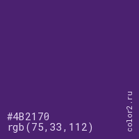 Цвет #4B2170 в цветовой модели RGB обозначается тремя октетами (75, 33, 112) в десятичном формате и #4B2170 в шестнадцатиричном (hex) формате, которые являются интенсивностью красного 75 (hex 4B), интенсивность зелёного 33 (hex 21) и интенсивность синего 112 (hex 70).