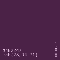 Цвет #4B2247 в цветовой модели RGB обозначается тремя октетами (75, 34, 71) в десятичном формате и #4B2247 в шестнадцатиричном (hex) формате, которые являются интенсивностью красного 75 (hex 4B), интенсивность зелёного 34 (hex 22) и интенсивность синего 71 (hex 47).