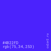 Цвет #4B22FD в цветовой модели RGB обозначается тремя октетами (75, 34, 253) в десятичном формате и #4B22FD в шестнадцатиричном (hex) формате, которые являются интенсивностью красного 75 (hex 4B), интенсивность зелёного 34 (hex 22) и интенсивность синего 253 (hex FD).