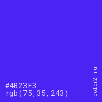 Цвет #4B23F3 в цветовой модели RGB обозначается тремя октетами (75, 35, 243) в десятичном формате и #4B23F3 в шестнадцатиричном (hex) формате, которые являются интенсивностью красного 75 (hex 4B), интенсивность зелёного 35 (hex 23) и интенсивность синего 243 (hex F3).