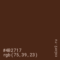 Цвет #4B2717 в цветовой модели RGB обозначается тремя октетами (75, 39, 23) в десятичном формате и #4B2717 в шестнадцатиричном (hex) формате, которые являются интенсивностью красного 75 (hex 4B), интенсивность зелёного 39 (hex 27) и интенсивность синего 23 (hex 17).