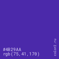 Цвет #4B29AA в цветовой модели RGB обозначается тремя октетами (75, 41, 170) в десятичном формате и #4B29AA в шестнадцатиричном (hex) формате, которые являются интенсивностью красного 75 (hex 4B), интенсивность зелёного 41 (hex 29) и интенсивность синего 170 (hex AA).