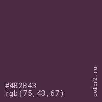 Цвет #4B2B43 в цветовой модели RGB обозначается тремя октетами (75, 43, 67) в десятичном формате и #4B2B43 в шестнадцатиричном (hex) формате, которые являются интенсивностью красного 75 (hex 4B), интенсивность зелёного 43 (hex 2B) и интенсивность синего 67 (hex 43).