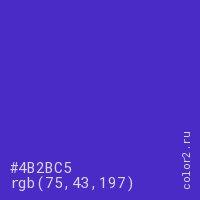 Цвет #4B2BC5 в цветовой модели RGB обозначается тремя октетами (75, 43, 197) в десятичном формате и #4B2BC5 в шестнадцатиричном (hex) формате, которые являются интенсивностью красного 75 (hex 4B), интенсивность зелёного 43 (hex 2B) и интенсивность синего 197 (hex C5).