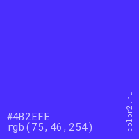 Цвет #4B2EFE в цветовой модели RGB обозначается тремя октетами (75, 46, 254) в десятичном формате и #4B2EFE в шестнадцатиричном (hex) формате, которые являются интенсивностью красного 75 (hex 4B), интенсивность зелёного 46 (hex 2E) и интенсивность синего 254 (hex FE).