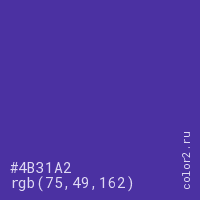 Цвет #4B31A2 в цветовой модели RGB обозначается тремя октетами (75, 49, 162) в десятичном формате и #4B31A2 в шестнадцатиричном (hex) формате, которые являются интенсивностью красного 75 (hex 4B), интенсивность зелёного 49 (hex 31) и интенсивность синего 162 (hex A2).