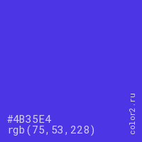 Цвет #4B35E4 в цветовой модели RGB обозначается тремя октетами (75, 53, 228) в десятичном формате и #4B35E4 в шестнадцатиричном (hex) формате, которые являются интенсивностью красного 75 (hex 4B), интенсивность зелёного 53 (hex 35) и интенсивность синего 228 (hex E4).