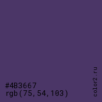 Цвет #4B3667 в цветовой модели RGB обозначается тремя октетами (75, 54, 103) в десятичном формате и #4B3667 в шестнадцатиричном (hex) формате, которые являются интенсивностью красного 75 (hex 4B), интенсивность зелёного 54 (hex 36) и интенсивность синего 103 (hex 67).