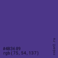 Цвет #4B3689 в цветовой модели RGB обозначается тремя октетами (75, 54, 137) в десятичном формате и #4B3689 в шестнадцатиричном (hex) формате, которые являются интенсивностью красного 75 (hex 4B), интенсивность зелёного 54 (hex 36) и интенсивность синего 137 (hex 89).