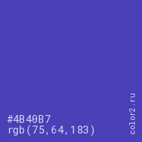 Цвет #4B40B7 в цветовой модели RGB обозначается тремя октетами (75, 64, 183) в десятичном формате и #4B40B7 в шестнадцатиричном (hex) формате, которые являются интенсивностью красного 75 (hex 4B), интенсивность зелёного 64 (hex 40) и интенсивность синего 183 (hex B7).