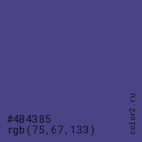Цвет #4B4385 в цветовой модели RGB обозначается тремя октетами (75, 67, 133) в десятичном формате и #4B4385 в шестнадцатиричном (hex) формате, которые являются интенсивностью красного 75 (hex 4B), интенсивность зелёного 67 (hex 43) и интенсивность синего 133 (hex 85).