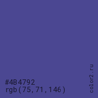 Цвет #4B4792 в цветовой модели RGB обозначается тремя октетами (75, 71, 146) в десятичном формате и #4B4792 в шестнадцатиричном (hex) формате, которые являются интенсивностью красного 75 (hex 4B), интенсивность зелёного 71 (hex 47) и интенсивность синего 146 (hex 92).