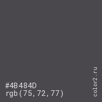 Цвет #4B484D в цветовой модели RGB обозначается тремя октетами (75, 72, 77) в десятичном формате и #4B484D в шестнадцатиричном (hex) формате, которые являются интенсивностью красного 75 (hex 4B), интенсивность зелёного 72 (hex 48) и интенсивность синего 77 (hex 4D).