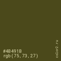 Цвет #4B491B в цветовой модели RGB обозначается тремя октетами (75, 73, 27) в десятичном формате и #4B491B в шестнадцатиричном (hex) формате, которые являются интенсивностью красного 75 (hex 4B), интенсивность зелёного 73 (hex 49) и интенсивность синего 27 (hex 1B).