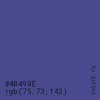 Цвет #4B498E в цветовой модели RGB обозначается тремя октетами (75, 73, 142) в десятичном формате и #4B498E в шестнадцатиричном (hex) формате, которые являются интенсивностью красного 75 (hex 4B), интенсивность зелёного 73 (hex 49) и интенсивность синего 142 (hex 8E).