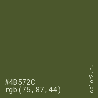 Цвет #4B572C в цветовой модели RGB обозначается тремя октетами (75, 87, 44) в десятичном формате и #4B572C в шестнадцатиричном (hex) формате, которые являются интенсивностью красного 75 (hex 4B), интенсивность зелёного 87 (hex 57) и интенсивность синего 44 (hex 2C).