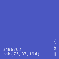 Цвет #4B57C2 в цветовой модели RGB обозначается тремя октетами (75, 87, 194) в десятичном формате и #4B57C2 в шестнадцатиричном (hex) формате, которые являются интенсивностью красного 75 (hex 4B), интенсивность зелёного 87 (hex 57) и интенсивность синего 194 (hex C2).