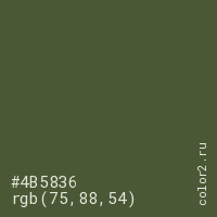 Цвет #4B5836 в цветовой модели RGB обозначается тремя октетами (75, 88, 54) в десятичном формате и #4B5836 в шестнадцатиричном (hex) формате, которые являются интенсивностью красного 75 (hex 4B), интенсивность зелёного 88 (hex 58) и интенсивность синего 54 (hex 36).