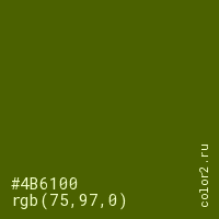 Цвет #4B6100 в цветовой модели RGB обозначается тремя октетами (75, 97, 0) в десятичном формате и #4B6100 в шестнадцатиричном (hex) формате, которые являются интенсивностью красного 75 (hex 4B), интенсивность зелёного 97 (hex 61) и интенсивность синего 0 (hex 00).