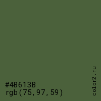 Цвет #4B613B в цветовой модели RGB обозначается тремя октетами (75, 97, 59) в десятичном формате и #4B613B в шестнадцатиричном (hex) формате, которые являются интенсивностью красного 75 (hex 4B), интенсивность зелёного 97 (hex 61) и интенсивность синего 59 (hex 3B).