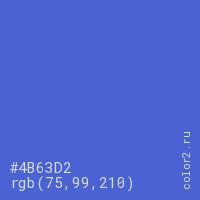 Цвет #4B63D2 в цветовой модели RGB обозначается тремя октетами (75, 99, 210) в десятичном формате и #4B63D2 в шестнадцатиричном (hex) формате, которые являются интенсивностью красного 75 (hex 4B), интенсивность зелёного 99 (hex 63) и интенсивность синего 210 (hex D2).