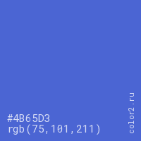 Цвет #4B65D3 в цветовой модели RGB обозначается тремя октетами (75, 101, 211) в десятичном формате и #4B65D3 в шестнадцатиричном (hex) формате, которые являются интенсивностью красного 75 (hex 4B), интенсивность зелёного 101 (hex 65) и интенсивность синего 211 (hex D3).