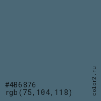 Цвет #4B6876 в цветовой модели RGB обозначается тремя октетами (75, 104, 118) в десятичном формате и #4B6876 в шестнадцатиричном (hex) формате, которые являются интенсивностью красного 75 (hex 4B), интенсивность зелёного 104 (hex 68) и интенсивность синего 118 (hex 76).