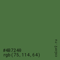 Цвет #4B7240 в цветовой модели RGB обозначается тремя октетами (75, 114, 64) в десятичном формате и #4B7240 в шестнадцатиричном (hex) формате, которые являются интенсивностью красного 75 (hex 4B), интенсивность зелёного 114 (hex 72) и интенсивность синего 64 (hex 40).