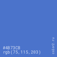 Цвет #4B73CB в цветовой модели RGB обозначается тремя октетами (75, 115, 203) в десятичном формате и #4B73CB в шестнадцатиричном (hex) формате, которые являются интенсивностью красного 75 (hex 4B), интенсивность зелёного 115 (hex 73) и интенсивность синего 203 (hex CB).