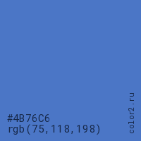 Цвет #4B76C6 в цветовой модели RGB обозначается тремя октетами (75, 118, 198) в десятичном формате и #4B76C6 в шестнадцатиричном (hex) формате, которые являются интенсивностью красного 75 (hex 4B), интенсивность зелёного 118 (hex 76) и интенсивность синего 198 (hex C6).