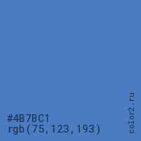 Цвет #4B7BC1 в цветовой модели RGB обозначается тремя октетами (75, 123, 193) в десятичном формате и #4B7BC1 в шестнадцатиричном (hex) формате, которые являются интенсивностью красного 75 (hex 4B), интенсивность зелёного 123 (hex 7B) и интенсивность синего 193 (hex C1).