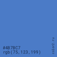 Цвет #4B7BC7 в цветовой модели RGB обозначается тремя октетами (75, 123, 199) в десятичном формате и #4B7BC7 в шестнадцатиричном (hex) формате, которые являются интенсивностью красного 75 (hex 4B), интенсивность зелёного 123 (hex 7B) и интенсивность синего 199 (hex C7).