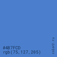 Цвет #4B7FCD в цветовой модели RGB обозначается тремя октетами (75, 127, 205) в десятичном формате и #4B7FCD в шестнадцатиричном (hex) формате, которые являются интенсивностью красного 75 (hex 4B), интенсивность зелёного 127 (hex 7F) и интенсивность синего 205 (hex CD).