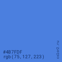 Цвет #4B7FDF в цветовой модели RGB обозначается тремя октетами (75, 127, 223) в десятичном формате и #4B7FDF в шестнадцатиричном (hex) формате, которые являются интенсивностью красного 75 (hex 4B), интенсивность зелёного 127 (hex 7F) и интенсивность синего 223 (hex DF).