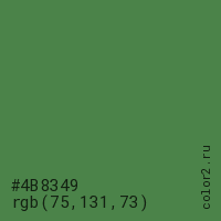 Цвет #4B8349 в цветовой модели RGB обозначается тремя октетами (75, 131, 73) в десятичном формате и #4B8349 в шестнадцатиричном (hex) формате, которые являются интенсивностью красного 75 (hex 4B), интенсивность зелёного 131 (hex 83) и интенсивность синего 73 (hex 49).