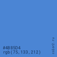 Цвет #4B85D4 в цветовой модели RGB обозначается тремя октетами (75, 133, 212) в десятичном формате и #4B85D4 в шестнадцатиричном (hex) формате, которые являются интенсивностью красного 75 (hex 4B), интенсивность зелёного 133 (hex 85) и интенсивность синего 212 (hex D4).