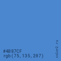 Цвет #4B87CF в цветовой модели RGB обозначается тремя октетами (75, 135, 207) в десятичном формате и #4B87CF в шестнадцатиричном (hex) формате, которые являются интенсивностью красного 75 (hex 4B), интенсивность зелёного 135 (hex 87) и интенсивность синего 207 (hex CF).