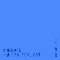 Цвет #4B89FD в цветовой модели RGB обозначается тремя октетами (75, 137, 253) в десятичном формате и #4B89FD в шестнадцатиричном (hex) формате, которые являются интенсивностью красного 75 (hex 4B), интенсивность зелёного 137 (hex 89) и интенсивность синего 253 (hex FD).