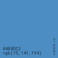 Цвет #4B8DC2 в цветовой модели RGB обозначается тремя октетами (75, 141, 194) в десятичном формате и #4B8DC2 в шестнадцатиричном (hex) формате, которые являются интенсивностью красного 75 (hex 4B), интенсивность зелёного 141 (hex 8D) и интенсивность синего 194 (hex C2).